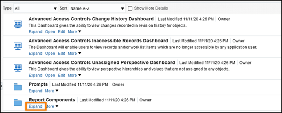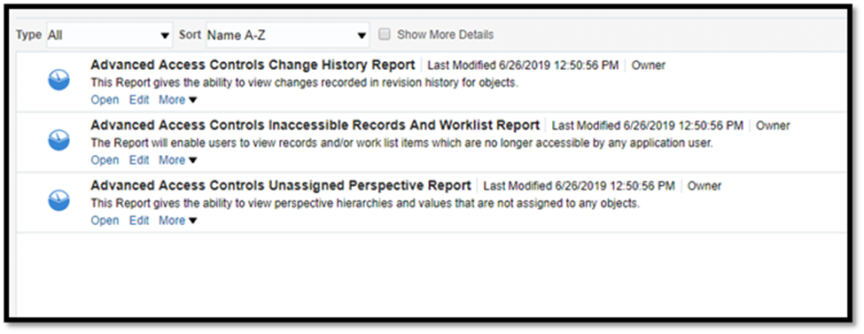 - Within the “Report Components” folder, you’ll find various pre-built reports, including “Advanced Access Controls Change History Report,” “Advanced Access Controls Inaccessible Records and Worklist Report,” and “Advanced Access Controls Unassigned Perspective Report.”